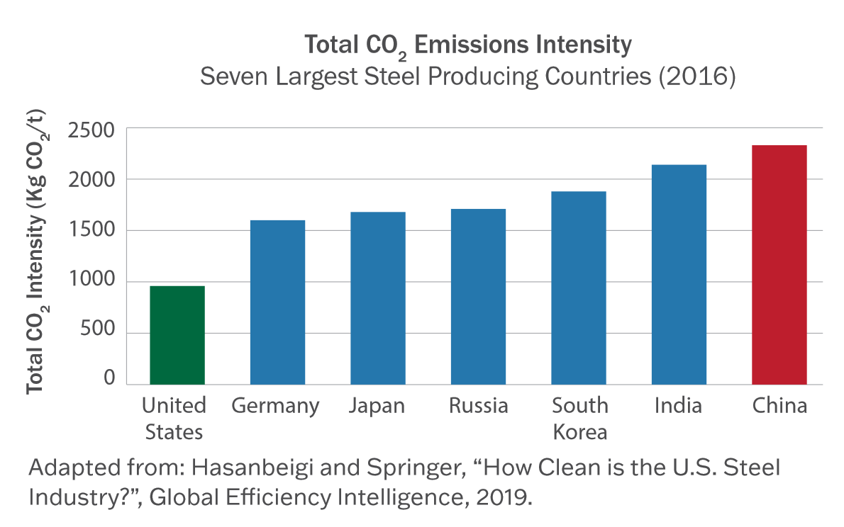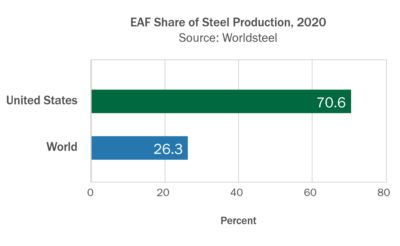 The United States produces a much higher portion of its steel from electric arc furnaces (EAFs) compared to global competitors, resulting in lower emissions of CO2 from steelmaking.