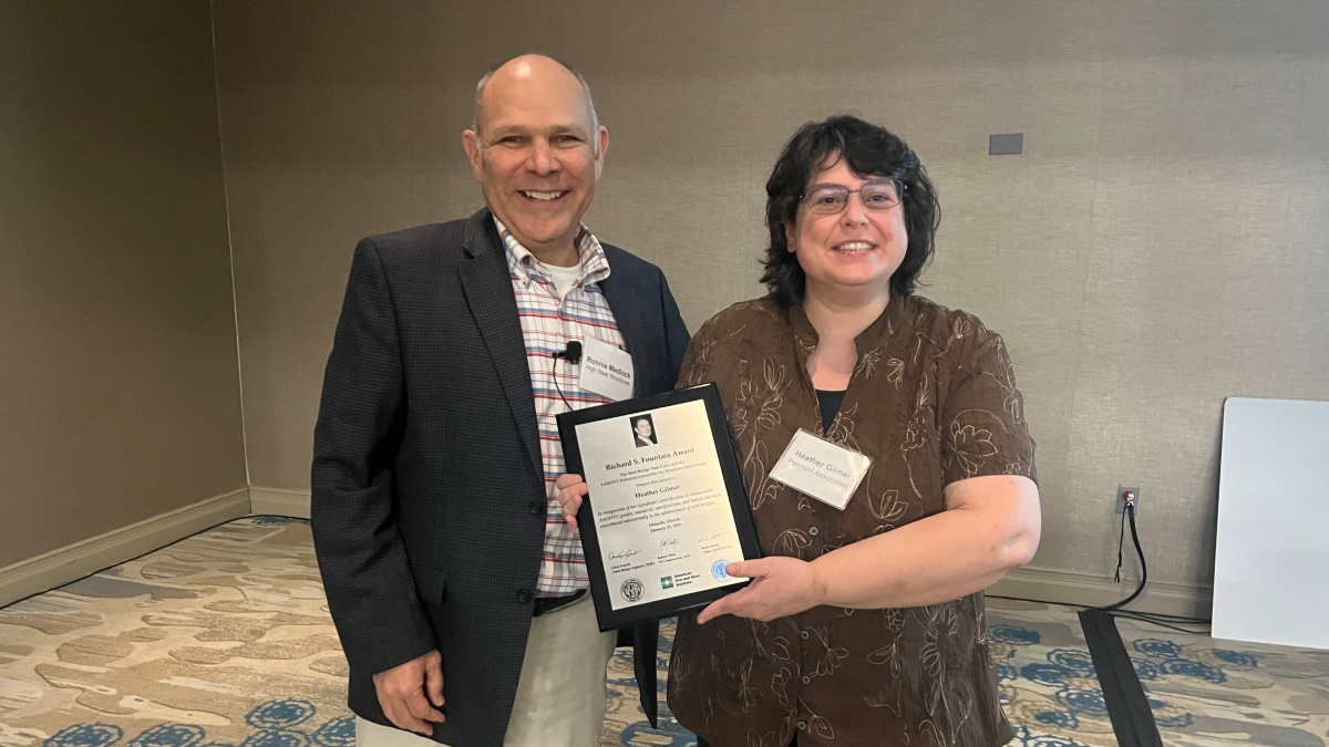 Heather received the award at the meeting of the Steel Bridge Task Force on January 25, 2023 in Orlando, Florida. It was presented by Ronnie Medlock of High Steel Structures, a previous winner of the Richard S. Fountain Award and a member of the Steel Bridge Task Force Oversight Council.