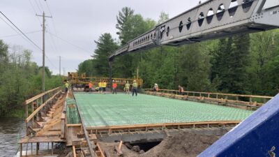 Recently, Valmont Structures installed a multi-span bridge in Michigan using PBTG technology. The following picture are from the installation of the 104’ span bridge. All 12 girders were delivered and installed in a single morning, using a crane from a single location behind the abutment. A cast-in-place deck was set the following week.