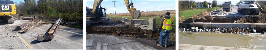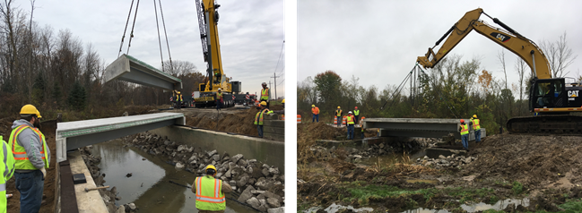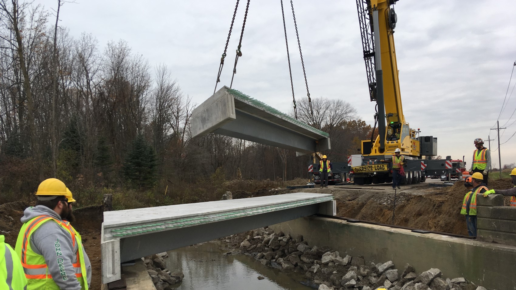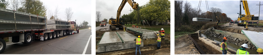 Over the next three days, the roadway approaches were paved with asphalt, and the drainage ditches in all four quadrants were regraded and seeded. Guardrail was installed on the bridge deck utilizing anchor bolt holes that were precast into the Con-Struct™ bridge deck fascia units. The St. Clair County Road Commission was able to successfully replace these two deteriorated bridges in just over a week by using innovative prefabricated structural elements. With the use of the Con-Struct™ Prefabricated Bridge System, this project provided a new structure with a service life of over 60 years that is sustainable, cost-effective, aesthetically pleasing and environmentally friendly.