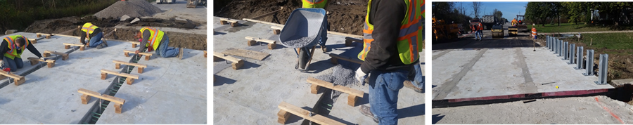 The six individual units were then tied together with a concrete closure pour. The SCRC maintenance crew cast a 6-inch-wide High Performance Concrete deck joint, creating a continuous 41’-6”-wide concrete bridge deck. Transpo Industries T-17 Methacrylate Polymer Concrete was used in the deck joint. The deck joint width and rebar lap length were specifically designed for the T-17 material based on rebar development length testing provided by Transpo Industries.