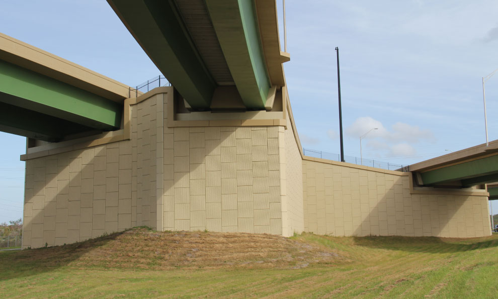 The T-WALL® retaining wall system combines the design principles of precast concrete modular walls with the gravity wall. The precast concrete, T-shaped wall segments that make up the retaining wall are designed to stack and interlock to create the wall surface. The stems of the “Ts” have a friction interaction with the soil backfill placed behind the wall. This method causes the system to act as a stable gravity wall.