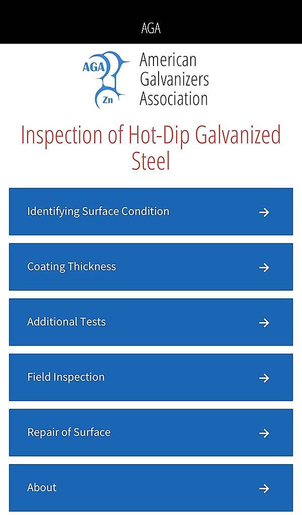 The American Galvanizers Association (AGA) has created a comprehensive app to aid in the inspection of hot-dip galvanized steel. The app is a visual guide to identifying various surface conditions present after hot-dip galvanizing.